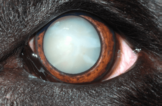 Note that nearly all senior dogs (and many other senior animals) will experience a hardening of the lens, which will cause a grayish or cloudy appearance. This is known as nuclear sclerosis and is not a cataract. Nuclear sclerosis typically does not inhibit the animal’s vision in the way a cataract does. However, it is very difficult for the ordinary pet owner to tell the difference between nuclear sclerosis and cataracts; it’s best to have a professional veterinary ophthalmologist take a look at your pet to determine which condition he or she may have.